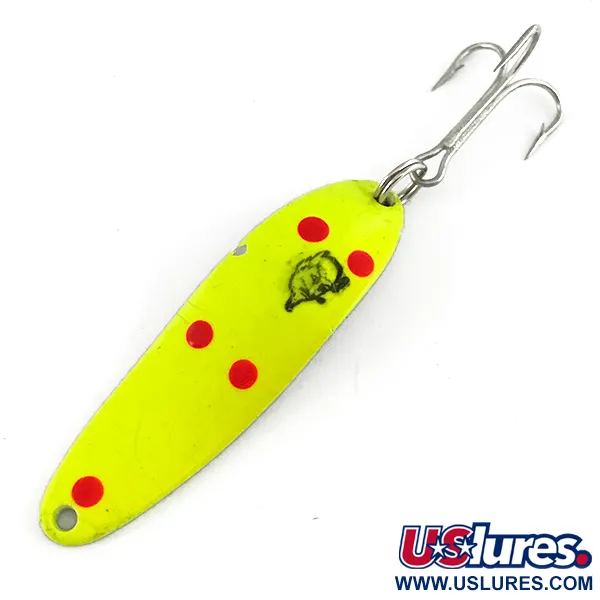 Med en vikt på exakt 10 g (1/3 oz) är Cop-E-Cat 7300 UV balanserad för konsekvent prestanda vid både spinnfiske och trolling. Profilen är lackerad i en högvisibel fluorescerande gul färg med fem tydliga röda prickar, ett mönster specifikt framtaget för att reagera på ultraviolett ljus. Som framgår av den andra bilden lyser den UV-aktiva beläggningen i starkt grönt, vilket hjälper skeddraget att förbli synligt för rovfiskar på djupare vatten eller i grumliga förhållanden där det naturliga ljuset avtar. Framsidan är präglad med den ikoniska Eppinger-djävulslogotypen, ett signum för tillverkaren från Dearborn, Michigan, som har varit verksam sedan 1906. Draget mäter 5,5 cm (2 1/4"), har produktkod 7396 och är i skick 5/5 utan tecken på ålder eller slitage på den målade ytan. Komponenterna består av en kraftig fjäderring i metall och en vass, silverfärgad trekrok, båda original till draget.