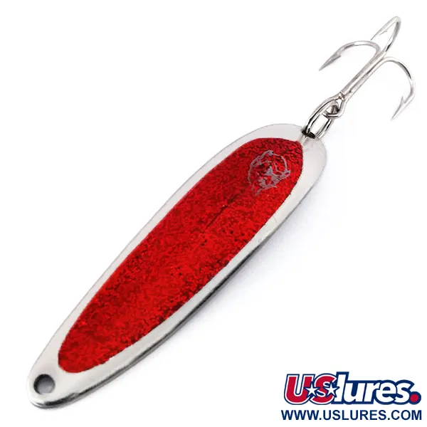 På baksidan finns den tydliga stämpeln "COP-E-CAT 7400 DETROIT U.S.A.", vilket förankrar detta skeddrags arv i Eppingers ursprungliga hemstad före flytten till Dearborn 1959. Detta 2 1/2" (6,5 cm) drag har ett distinkt färgschema i rött och nickel, där ett strukturerat, glitterfläckigt rött inlägg sitter i en polerad nickelram. Med en vikt på 3/4oz (21 g) är betet byggt för betydande kastlängder och håller djupet väl vid jämn invevning. Komponenterna är klassisk Eppinger, med en stark trekrok säkrad av en kraftig fjäderring. För en samlare är det värt att notera att detta exemplar har skicket 5/5, då nickelytan har kvar sin spegelglans och de stämplade bokstäverna är skarpa. Cop-E-Cat 7400, en del av den bredare Dardevle-familjen med produktkod 10473, representerar utvecklingen av Lou Eppingers ursprungliga design från 1906 till ett mångsidigt sortiment som till och med användes i militära överlevnadskit. Den avlånga, konkava kroppen är utformad för den karakteristiska vaggande gången som har varit en stapelvara i fiskelådor i över ett sekel.