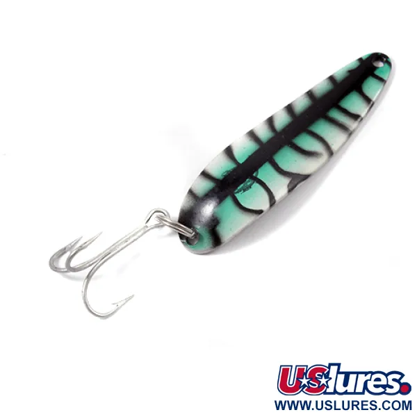 En vikt på 14 g (1/2 oz) gör detta skeddrag till ett mångsidigt val för både spinnfiske och trolling. Den 6,5 cm (2 1/2") långa kroppen är dekorerad i ett slående grodmönster, med djupgröna och gräddvita fält som delas av kraftiga svarta ränder. Om man vänder på draget syns den klassiska förnicklade baksidan, tydligt stämplad med "COP-E-CAT 7400" och "DETROIT USA". Denna specifika Detroit-märkning är en blinkning till företaget Eppingers tidiga historia före flytten till Dearborn 1959. Detta exemplar med produktkod 2137 är bevarat i nyskick (5/5), med en blank reflekterande yta och precist målarbete. Skeddraget är utrustat med en kraftig silverfärgad trekrok som sitter fast i en robust fjäderring i stjärten. Materialvalet och det tunga metallarbetet vittnar om den höga kvalitetsstandard som Lou Eppinger etablerade för sitt Detroit-grundade märke redan 1906.