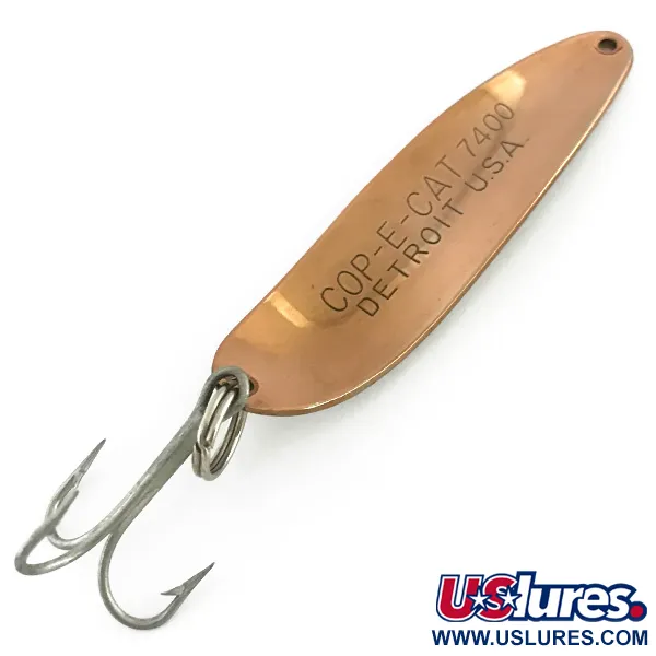 Tydligt präglat i den kopparpläterade framsidan finns märkningen "COP-E-CAT 7400 DETROIT U.S.A.", ett kännetecken för Eppingers tillverkningshistoria i Michigan. Denna Dardevle Cop-E-Cat 7400, identifierad med kod 8605, har en klassisk tvåtonsfinish med varm, polerad koppar på den konvexa framsidan och ljus, reflekterande nickel på den konkava baksidan. Med en längd på 6,5 cm (2 1/2") och en vikt på 14 g (1/2 oz) är skeddraget en mångsidig storlek som lämpar sig för både spinnfiske och trolling. Kontrasten mellan de två metallerna är utformad för synlighet; kopparsidan fungerar väl i grumligt vatten, medan nickelbaksidan ger starka reflexer i klarare miljöer. Detta specifika exemplar är i utmärkt, rent skick och får betyget 5/5. Det har kvar sin originalutrustning, inklusive en robust fjäderring och en vass trekrok. Den karakteristiska avlånga formen, ett signum för Lou Eppingers design sedan 1906, är skapad med egna pressverktyg för att säkerställa den traditionellt vobblande gången.