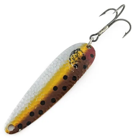 En hamrad finish ger framsidan på detta Eppinger-skeddrag ett realistiskt skimmer som fångar ljuset över dess silver-, gul- och brunöringsinspirerade mönster. Med en rejäl vikt på 50 g (1 3/4 oz) ger det den tyngd som krävs för djuptrolling eller långdistanskast. Baksidan av draget avslöjar dess arv från Michigan, stämplat med 'COP-E-CAT 7700 DEARBORN MICH' och den välkända djävulslogotypen på en ren mässingsyta. Kroppen mäter 11 cm (4 1/4") och pryds av tydliga svarta prickar som kontrasterar mot de varma gula och bruna färgövergångarna. Detta exemplar, med produktkod 23290, är i skick 4/5 och visar endast lätta spår av sin fiskehistorik på originaldetaljerna. Den stora trekroken sitter säkert monterad med en kraftig fjäderring, vilket säkerställer att dragets strukturella integritet förblir intakt.