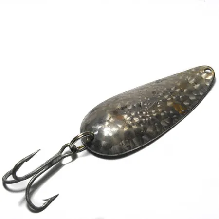 En hamrad silverfinish med fjällmönster fångar ljuset på detta 3" (7,5 cm) Eppinger skeddrag, en design som har tillverkats med egna gjutformar sedan företagets tidiga dagar i Michigan. Detta exemplar, med produktkod 0305, har färgsättningen Crystal (Scale Silver), vilket ger en mångfacetterad reflektion i vattnet jämfört med vanliga släta skeddrag. Det klassiska namnet Dardevlet är tydligt stämplat i dragets konkava baksida, vilket markerar dess äkthet och amerikanska arv. I skick 4/5 förblir metallytorna blanka, och den ursprungliga trekroken är säkert fäst via en kraftig fjäderring. Den avlånga geometrin och den djupa skålformen är konstruerade av Eppinger för att skapa en tydlig vaggande gång vid jämn invevning. För klart vatten fungerar den förnicklade baksidan och den fjällmönstrade framsidan som en naturlig presentation för rovfisk. Infästningspunkten i den avsmalnande änden visar minimalt slitage, vilket tyder på att detta specifika drag har skötts väl i en samlares fiskelåda.