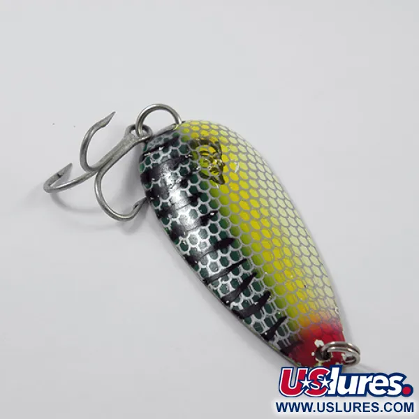 En mässingsfinish på den konkava sidan av detta 3/4 oz (21 g) skeddrag bär de stämplade kännetecknen ”Dardevlet” och ”Eppinger”. Detta exemplar på 2 3/4 tum (7 cm), listat under produktkod 2691, visar ett Perch-färgmönster med en gul-grön bikakeformad fjällstruktur över vertikala svarta ränder och röda detaljer i ändarna. Eppinger flyttade produktionen från Detroit till Dearborn, Michigan, 1959, och de fortsätter att använda sina egna formar för att uppnå denna specifika avlånga form som har definierat varumärket i över ett sekel. Monteringen består av en klassisk trekrok fäst med en fjäderring. Skicket är 4/5, med en ren yta och minimala spår av hantering genom åren. Vid fiske tillåter en långsam invevning den tunga mässingskroppen att blänka effektivt. Designens pålitlighet är legendarisk och den ingick till och med i flygets överlevnadskit under krigstid tack vare sin bevisade förmåga att leverera resultat. Kombinationen av den texturerade fjällfinishen och den varma mässingsundersidan gör det till ett givet val för sportfiskare som jagar rovfisk under olika siktförhållanden i vattnet.