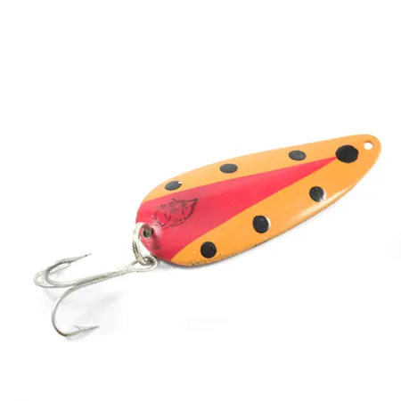 Orange och röda pigment skapar ett slående visuellt mönster på detta skeddrag, accentuerat av en serie tydliga svarta prickar. Med en vikt på 21 g (3/4 oz) och en längd på 7 cm (2 3/4"), är detta Eppinger Dardevle Dardevlet (produktkod: 2692) en viktig del av Detroits fiskehistoria. Framsidan har en central röd kil-design och den ikoniska djävulsansikts-logotypen stämplad nära huvudet. På baksidan är den rena nickelfinishen djupt stämplad med 'DARDEVLET DETROIT U.S.A.', vilket refererar till märkets ursprungliga tillverkningsort före flytten till Dearborn 1959. Detta exemplar är i 5/5 skick och framstår som exceptionellt välbevarat med livfull färg och tydliga, skarpa metallmarkeringar. Utrustningen inkluderar en traditionell silverfärgad trekrok fäst med en stark fjäderring vid stjärten. Lou Eppingers arv, som började 1906, syns i den exakta kurvan på dragets kropp, formad av egna formar för att uppnå dess avsedda rörelse under jämn invevning eller vid trolling. Denna specifika färgkombination är högt ansedd för sin synlighet i varierande vattenförhållanden.