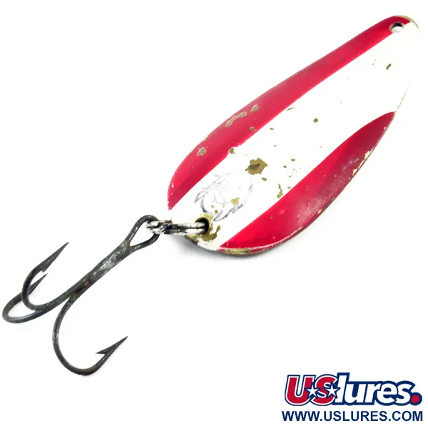 Med en vikt på 21 g (3/4 oz) bär detta klassiska skeddrag den omisskännliga tyngden av en sann kastlegend. Eppinger Dardevle Dardevlet, med produktkod 3133, mäter 7 cm (2 3/4") på längden och har det klassiska röd- och vitrandiga mönstret på ovansidan. Små nagg i emaljen blottar mässingsgrunden, vilket ger karaktär åt ett bete som tydligt har varit en aktiv del av en sportfiskares utrustning. På baksidan finns stämplarna ”DARDEVLET” och ”DETROIT U.S.A.” präglade direkt i mässingen, en detalj som daterar dess ursprung till före företagets flytt till Dearborn 1959. Detta exemplar, med skicket 4/5, har kvar sin originalkrok och är ett gediget exempel på de unika stansade former som Lou Eppinger populariserade i Michigan. Dess konkava yta och tunga konstruktion gör det lika lämpligt för långa kast som för djuptrolling.