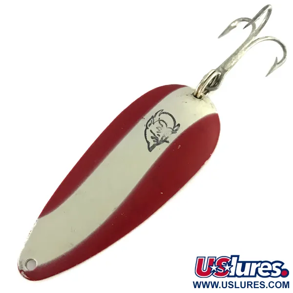 Med en vikt på 21 g (3/4 oz) är denna Eppinger Dardevlet ett rejält skeddrag som känns gediget i handen. Framsidan bär de ikoniska röda och vita diagonala ränderna, med den distinkta svarta djävulshuvudslogotypen prydligt stämplad i den mittersta vita sektionen. Denna specifika modell mäter 7 cm (2 3/4") och har en polerad kopparbaksida. På baksidan är stämplingen "DARDEVLET" DETROIT U.S.A. djupt präglad, vilket speglar företagets tillverkningshistoria i Detroit före flytten till Dearborn 1959. Den tunga konkava kroppen är parad med en vass trekrok i vintagestil, säkrad med en pålitlig fjäderring. Detta exemplar är i utmärkt skick (5/5) med tydlig grafik och livfull emalj.