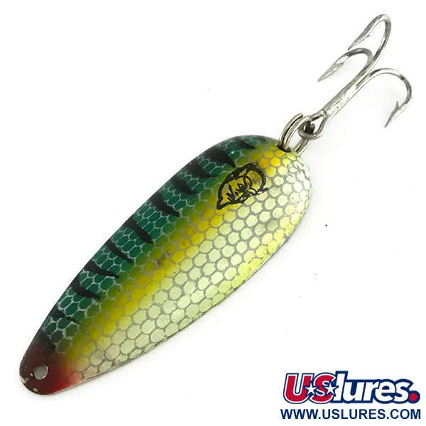Tydligt inpräglat på den mässingsfärgade baksidan finns namnet "DARDEVLET" tillsammans med ursprunget "DEARBORN MI" och viktangivelsen "3/4 OZ.". Detta skeddrag på 21 g (3/4 oz) har det karaktäristiska Abborre-mönstret, utfört med en fjälliknande våffelmönstring över en levande gul och grön gradient. Mörka vertikala ränder ger realistisk kontrast, avslutad med en subtil röd accent vid spetsen nära linhållaren. Framsidan visar tydligt den ikoniska svarta djävulshuvud-logotypen, ett signum för varumärket Eppinger sedan grundandet 1906. Draget mäter 7 cm (2 3/4") och är utrustat med en robust trekrok fäst via en fjäderring baktill. Detta exemplar, identifierat med produktkod 8442, är i exceptionellt skick och får betyget 5/5 för sina rena ytor och skarpa präglingar. Sedan Eppinger flyttade produktionen till Dearborn 1959, fungerar detta drag som en viktig del av Michigans sportfiskehistoria. Dess konstruktion i massiv mässing och viktade profil är designad för både spinnfiske och trolling under varierande vattenförhållanden.