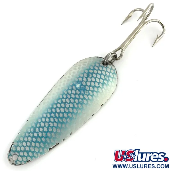 Ett blått fjällmönster sticker ut mot den vita finishen på detta klassiska skeddrag. Tydligt stämplat på den polerade nickelbaksidan finns namnet "DARDEVLET" tillsammans med "DETROIT U.S.A.", vilket markerar dess arv från Eppingers tidiga produktionsera. Med en vikt på 21 g (3/4 oz) och en längd på 7 cm (2 3/4") representerar detta exemplar, identifierat med produktkod 8722, en klassisk vikt för långdistanskast eller djuptrolling. Framsidan har en distinkt fjälliknande textur skapad av blå överspray på en vit bas, vilket ger hög kontrast och synlighet. Detta bete har kvar sin originalmontering, inklusive en kraftig trekrok fäst via en fjäderring i aktern. Skeddraget har ett skickbetyg på 4/5 och bär sin ålder med värdighet, med rena ytor och en blank metallisk baksida. Det förblir ett funktionellt stycke hantverk från Detroit och den legendariska Eppinger-serien.