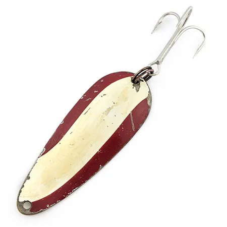 Detta vintage skeddrag kännetecknas av en distinkt Red Devle-finish, med den ikoniska vita mittlinjen mellan två röda fält. Detta exemplar på 21 g (3/4 oz) visar autentiska tecken på användning med synliga färgsläpp och naggade kanter, vilket speglar dess historik som en flitigt använd trotjänare med ett skickbetyg på 3/5. Kroppen i kraftig metall mäter 7 cm (2 3/4") och är stämplad på baksidan med den klassiska '“DARDEVLET” DETROIT U.S.A.'-märkningen, ett signum för Eppingers produktion från 1920- till 40-talet. Betet har produktkod 22794 och är utrustat med en robust fjäderring och en stor trekrok i stjärten. Den metalliska baksidan är fortfarande blank, vilket kontrasterar mot den slitna emaljen på framsidan. Detta USA-tillverkade bete designades för kastfiske på djupare vatten, där dess tyngd gjorde det möjligt att nå djup som mindre skeddrag inte når.