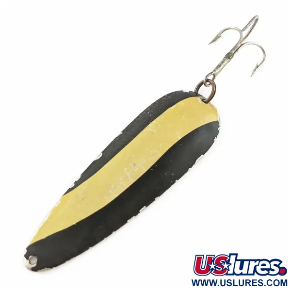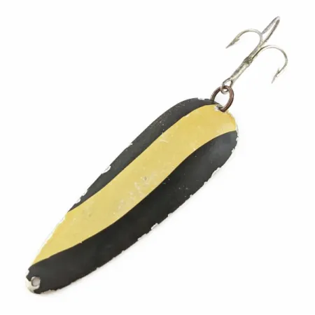 Detta droppformade skeddrag väger 28 g och representerar en betydande del av amerikansk sportfiskehistoria från 1930-talet. Färgsättningen Black Devle har en tydlig gul diagonal rand mot en djupsvart bakgrund, ett karaktäristiskt färgschema från Eppingers tidiga produktionsera i Detroit, USA. Metalkroppen är 9 cm lång och bär spår av tidens tand med ett skick på 4/5, vilket visar sig genom visst färgsläpp längs kanterna. En stor trekrok är fäst i bakändan med en fjäderring, avsedd för spinnfiske eller trolling efter större sötvattensrovfiskar. Denna vintage-raritet, med produktkod 24040, är ett fundamentalt objekt för varje samling som fokuserar på utvecklingen av det ikoniska varumärket Dardevle.