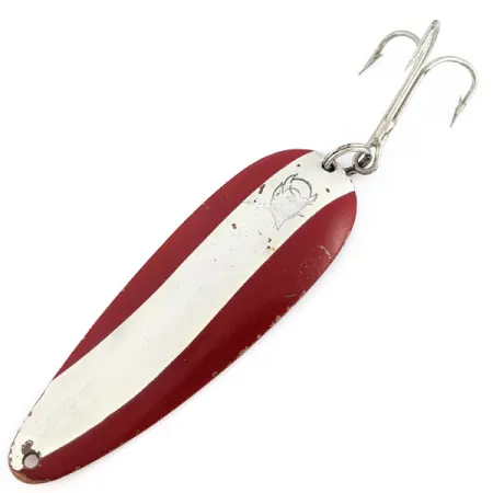 Med en längd på 9 cm från spets till stjärt ger det klassiska Red Devle-mönstret på detta exemplar en visuell kontrast som har definierat varumärket Eppinger i decennier. En rejäl vikt på 28 g gör detta specifika skeddrag till ett pålitligt val för långdistanskast eller för att nå djupare vattenlager där rovfiskar står. På den kopparfärgade baksidan finns den autentiska stämpeln ”DARDEVLE DETROIT, U.S.A.”, vilket visar att draget tillverkades innan företaget flyttade till Dearborn 1959. Detta exemplar med produktkod 22101 är i skick 4/5, med visst färgsläpp och små flagor längs kanterna och nära djävulshuvudlogotypen på den vita mittranden. Original-trekroken sitter kvar med en kraftig fjäderring, vilket vittnar om den robusta hårdvara som var typisk för dessa drag från Detroit-eran. Den konkava, avlånga kroppen är formad med de patenterade verktyg som Lou Eppinger utvecklade för att säkerställa ett specifikt vattenmotstånd och stabilitet i kasten. Den röd-vita emaljytan är fortfarande blank över större delen av ytan och bevarar det klassiska utseendet hos en stapelvara i fiskelådor från mitten av seklet.
