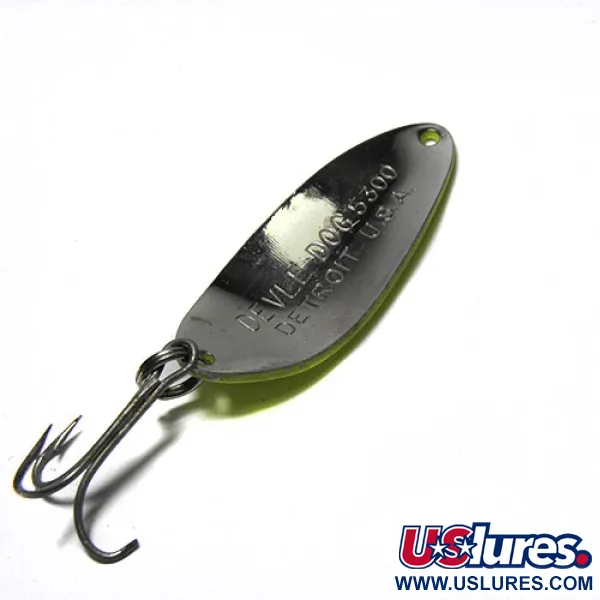 Med en vikt på 10g (1/3oz) har detta Eppinger Dardevle Devle Dog skeddrag en högvisuell klargul finish prydd med fem tydliga röda prickar. Med en längd på 5cm (2") har metallkroppen den klassiska konkava designen som har definierat varumärket sedan Lou Eppinger började tillverka drag i sin källare i Detroit 1906. Ytan har kvar en livlig lyster och den karakteristiska svarta djävulshuvudlogotypen är fortfarande skarp nära fjäderringen. Detta specifika exemplar, katalogiserat under produktkod 0267, representerar en stapelvara i amerikansk fiskeredskapshistoria, känd för sin utpräglade vaggande gång vid långsam hemtagning. Monteringen, inklusive trekroken, framstår som välskött, vilket bidrar till dess utmärkta skickgradering på 5/5. Det är ett genuint stycke kulturarv från Dearborn, Michigan, som speglar samma kvalitet som en gång gav dessa skeddrag en plats i militärflygets överlevnadskit. Vikten och balansen i 10g-kroppen gör den till ett mångsidigt val för olika kastförhållanden.