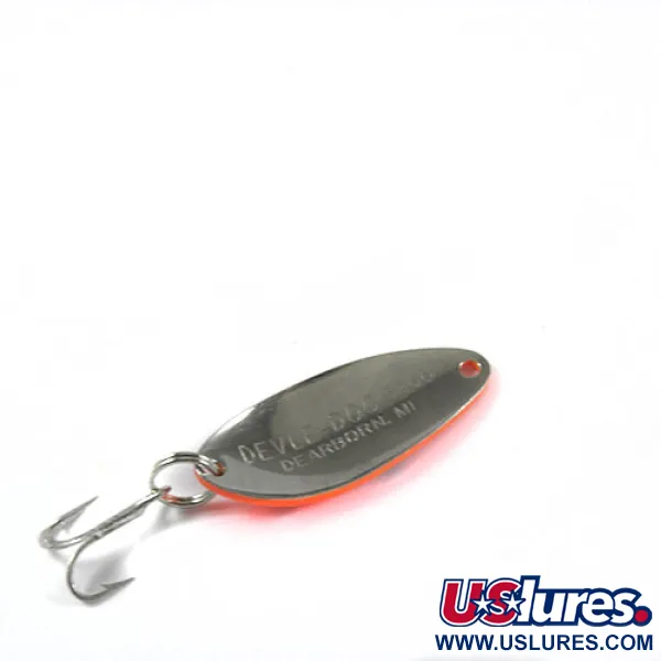 En vikt på 7,5 g ger Eppinger Dardevle Devle Dog 5200 en rejäl känsla trots sin kompakta storlek. Med en längd på 4 cm är metallkroppen utförd i en stark orange färg med stora svarta prickar, ett mönster som ger utmärkt kontrast under olika vattenförhållanden. Den ikoniska djävulshuvud-logotypen är stämplad på den konvexa sidan, vilket markerar dess ursprung från den legendariska tillverkaren i Michigan som har använt egna gjutformar sedan Lou Eppinger startade verksamheten 1906. Detta specifika föremål, identifierat med produktkod 0404, är i välskött skick med betyget 4/5. Det har en robust fjäderring och en enkel trekrok som ser ren och funktionell ut. För sportfiskare som uppskattar amerikansk redskapshistoria återspeglar denna 5200-modell samma hantverk som gjorde att dessa drag inkluderades i flygets överlevnadskit under krigstid. Den högkontrasterande orange och svarta finishen är ett givet val för många när man fiskar i grumligt vatten där synlighet är avgörande.