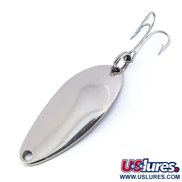 Polerad nickelplätering fångar ljuset längs den slanka profilen på detta 4 cm (1 1/2") skeddrag. Med en vikt på 7 g (1/4 oz) bär Eppinger Dardevle Devle Dog 5200 en tydlig "DETROIT U.S.A."-stämpel på sin konkava sida, vilket placerar produktionen i eran innan företaget flyttade till Dearborn 1959. Detta specifika exemplar, identifierat med produktkod 10446, är i 5/5-skick och har behållit sin briljanta spegelfinish utan synligt slitage. De stämplade bokstäverna är anmärkningsvärt skarpa, en detalj som ofta eftersöks av samlare av tidiga Michigan-tillverkade drag. Det är riggat med en stark fjäderring och en vass silverfärgad trekrok, designad för spinnfiske eller trolling i olika vattenförhållanden. Den kraftiga konstruktionen ger betydande massa för sin storlek, vilket möjliggör kontrollerade kastlängder även i motvind. Linöglan visar inga tecken på användning, vilket återspeglar dess välbevarade tillstånd under decennierna.