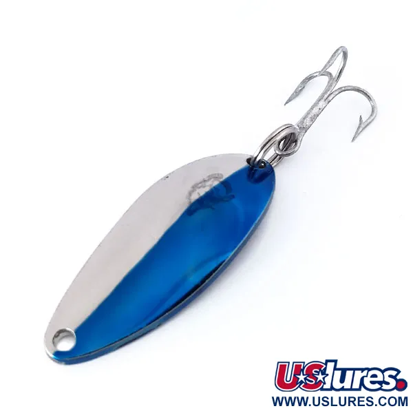 En slående diagonal uppdelning mellan en polerad nickelfinish och en djupblå färg definierar denna klassiker från Eppinger. Med en vikt på 7 g (1/4 oz) och en längd på 4 cm (1 1/2 tum) är denna Devle Dog 5200 i en mångsidig storlek för fiske efter olika sötvattensarter. På baksidan av metallen identifierar den tydliga stämplingen draget som en produkt från Dearborn, MI, vilket placerar dess produktionstid efter företagets flytt från Detroit 1959. Under produktkod 10447 har detta exemplar den karaktäristiska avlånga, konkava formen designad för att ge en tydlig vaggande gång vid hemtagning. Utrustningen inkluderar en robust fjäderring och en vass trekrok, som båda visar minimala tecken på ålder och bibehåller sin ursprungliga integritet. Finishen på båda sidor är mycket reflekterande, vilket ger det blänk som krävs för att synas i klart vatten. Med tanke på dess utmärkta skick får detta drag betyget 5/5. Det representerar det enkla och effektiva amerikanska hantverket som Lou Eppinger förespråkade sedan början av 1900-talet, specifikt utformat för spinnfiske och trolling.