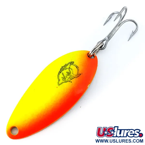Med en kompakt vikt på 7g (1/4oz) har metallkroppen på detta skeddrag en levande gradient från solgult till djupt, eldigt orangerött. Ytan pryds av Dardevles ikoniska "Devil Head"-stämpel i svart bläck nära mitten av den 4cm (1 1/2") långa ramen. Då denna Devle Dog 5200 (Produktkod 10819) är oanvänd är finishen i nyskick och har kvar sin ursprungliga lyster. Denna specifika variant har en fluorescerande beläggning som reagerar kraftigt under UV-ljus, vilket förvandlar dagsljusfärgerna till ett slående neongrönt och orange sken. Det är ett fascinerande tekniskt tillskott till ett varumärkesarv som startades av Lou Eppinger i Detroit redan 1906. Baksidan har en polerad nickelfinish, ett traditionellt val för att maximera blänket när ljuset träffar metallen. Hårdvaran inkluderar en vass trekrok fäst med en kraftig fjäderring, designad för kast på olika djup eller kontrollerad trolling. Till skillnad från det bredare Dardevle-standarddraget erbjuder Devle Dog en mer strömlinjeformad profil som ger en tydlig måltavla för gädda eller öring.
