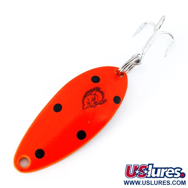 Polerad nickel täcker baksidan av detta 4 cm långa skeddrag, vilket ger en klar metallisk lyster som kompletterar den djärvt målade framsidan. Med produktkod 10931 är denna Devle Dog 5200 UV färdigställd i en högvisibel fluorescerande röd färg med fem tydliga svarta prickar som omger den klassiska Eppinger-djävulsstämpeln. Med en vikt på 7 g är metallkroppen konstruerad för balanserade kast och hållbarhet. Dragets finish är UV-reaktiv och skiftar till en djup, glödande orangeröd intensitet under ultraviolett ljus för att öka synligheten i grumligt vatten eller vid svaga ljusförhållanden. En vass, silverfärgad trekrok är säkrad med en robust fjäderring i aktern, medan fören har en ren ögla för linanslutning. Detta specifika exemplar är i oanvänt skick och ser ut exakt som när det lämnade fabriken i Michigan.