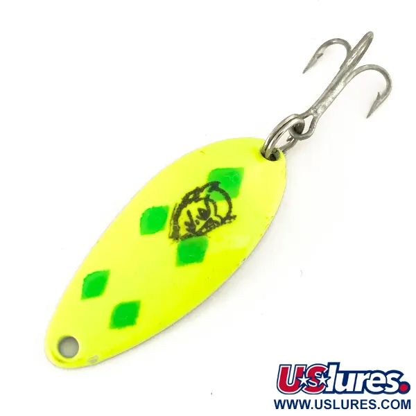 Detta 4 cm (1 1/2") långa skeddrag lyser starkt under UV-ljus och har en fluorescerande gul finish med hög synlighet, accentuerad av skarpa gröna diamantmönster. Detta specifika exemplar, identifierat med produktkod 7452, har den ikoniska svarta djävulshuvudstämpeln som har kännetecknat Eppingers legendariska amerikanska design i över ett sekel. Devle Dog 5200 UV väger 7 g (1/4 oz) och är konstruerad på en egentillverkad stansad metallkropp designad för både spinnfiske och trolling. Betet är i oanvänt skick och har kvar den fina fabriksfinishen och originalkvaliteten på hårdvaran som förväntas från anläggningen i Dearborn, Michigan. Dess specialiserade fluorescerande beläggning är framtagen för att ge visuell närvaro vid sämre ljusförhållanden eller i grumligt vatten. Detta givna inslag i fiskelådan speglar den långa tillverkningstradition som startades av Lou Eppinger 1906.