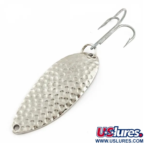 Den hamrade nickelfinishen på detta 21g (3/4oz) tunga skeddrag reflekterar ljuset effektivt tack vare den texturerade ytan. Med en längd på 6,5 cm (2 1/2") är Dardevle Devle Dog 5500 Detroit (1980-tal) en robust del av fiskehistorien från Michigan, listad under produktkod 24271. Samlare kommer att uppskatta Detroit-stämpeln, en hyllning till Lou Eppingers ursprungliga verkstad och varumärkets långa tradition av tillverkning i USA. Detta exemplar är exceptionellt välbevarat i skick 5/5, utan synligt slitage på pläteringen eller den ursprungliga silverfärgade trekroken. Dragets kraftiga gods kombineras med en robust fjäderring, vilket gör det till ett pålitligt val för långa kast. Det är ett utmärkt exempel på fiskeredskap från mitten av 80-talet, med en ren fästpunkt i nosen och den klassiska droppformade profilen som varit en stapelvara i fiskelådor under decennier.