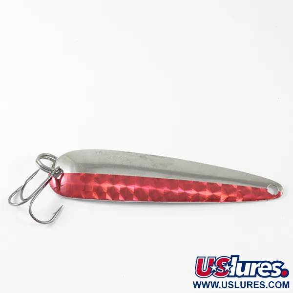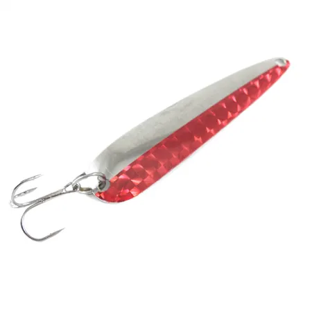 Med en vikt på 1/4oz (8g) uppvisar denna släpsked en högkontrastkombination av polerad nickel och ett texturerat rött prismatiskt fjällmönster på framsidan. Med en längd på 3 1/4" (8cm) är Dardevle Flutter-Chuck byggd på Eppingers egna matriser, vilket bibehåller den slanka profil som krävs för trollingsfiske. Baksidan har tillverkarens autentiska stämpel: 'FLUTTER CHUCK DETROIT U.S.A. # 1665', vilket markerar dess ursprung i Michigans fiskeredskapsindustri innan företaget flyttade till Dearborn. Detta specifika exemplar är i utmärkt skick, klassat 5/5, med en ren finish och en vass, original trekrok fäst via en robust fjäderring. Den röda tejpen är applicerad med precision längs ena kanten, vilket skapar en tvåfärgad visuell effekt mot den metalliska nickelkroppen. Tillverkningen av dessa skedar i USA använder specifika formar för att säkerställa den konsekventa form som krävs för trollingtekniken, en kvalitetsstandard som Eppinger har bibehållit sedan 1906.