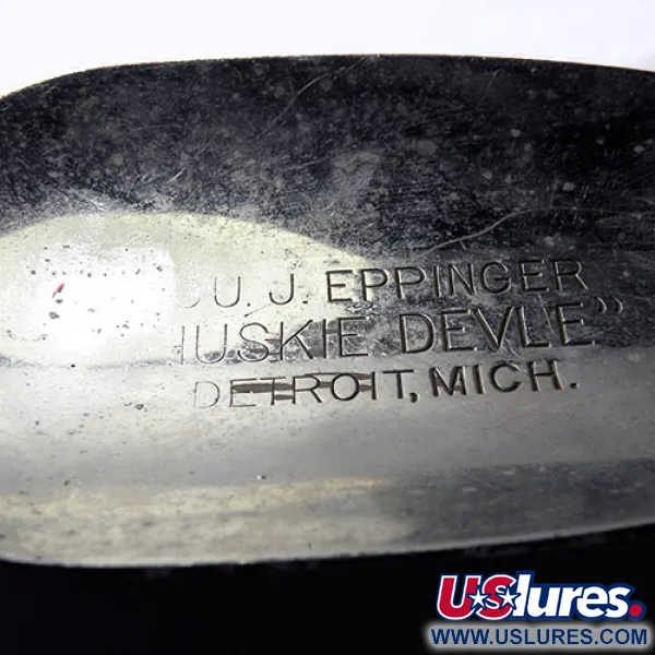 Med en vikt på rejäla 3 1/4 oz (91 g) är detta tunga skeddrag designat för kastfiske på djupt vatten eller trolling efter troféfiskar. Detta exemplar från Eppinger, känt som Huskie Devle (produktkod 0245), mäter hela 5 1/2" (14 cm) i längd. Den klassiska Röd / Vit-finishen på framsidan förstärks av en distinkt bikakestruktur som täcker de vita sektionerna. På baksidan syns den stämplade kromade ryggen, tydligt märkt med namnet "EPPINGER HUSKIE DEVLE" och ursprunget "DEARBORN, MICH.", vilket daterar draget till efter företagets flytt 1959. En unik egenskap hos just denna modell är det lilla gulmålade reflexbladet fäst i den bakre fjäderringen, dekorerat med röda diamanter och den ikoniska djävulshuvudlogotypen. Hårdvaran är robust, med en stor silverfärgad trekrok redo för tuffa tag. I skick 4/5 är färgen fortfarande livlig och metallen behåller en högkvalitativ lyster, vilket visar på den hållbara amerikanska hantverksskickligheten från eran. De stämplade detaljerna på baksidan är skarpa och läsbara mot den polerade ytan.
