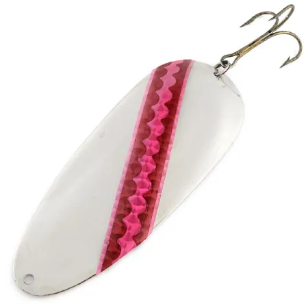 En karaktäristisk vågig röd-rosa rand går diagonalt över den polerade nickelytan på detta rejäla skeddrag på 2 oz (58 g). Det är identifierat som en Dardevle Huskie Junior 700-serie (artikelnummer 23288), och dess robusta kropp på 11,5 cm (4 1/2") är byggd för fiske efter stora rovfiskar genom trolling eller tungt spinnfiske. Betets baksida har den autentiska stämplade märkningen från Lou J. Eppinger i Detroit, Michigan, vilket vittnar om dess amerikanska ursprung. Utrustad med en stor, kraftig trekrok som är säkrad med en rejäl fjäderring i aktern. Den reflekterande nickelfinishen på framsidan är fortfarande mycket tydlig, medan den stämplade baksidan är blank och lättläst. Med ett skickbetyg på 4/5 är detta exemplar ett välbevarat exempel ur Eppingers tyngre sortiment och har kvar all den strukturella integritet som förväntas av ett klassiskt fiskeredskap.