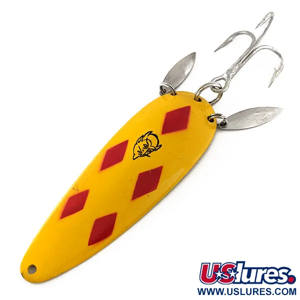 Fem djupröda diamanter mot en lysande gul bakgrund definierar det visuella uttrycket på detta 9 cm (3 1/2") långa drag från Eppinger. Detta robusta skeddrag på 28 g (1 oz), känt som Dardevle Klicker med produktkod 11542, har två små soniska silverblad monterade nära den bakre trekroken. Dessa hjälpsidoblad är utformade för att slå mot dragets kropp, vilket skapar ett metalliskt klickande ljud vid hemfiskning. Den guldfärgade baksidan har den tydliga stämpeln "DARDEVLE DETROIT, U.S.A.", vilket lyfter fram arvet från Lou Eppingers Michigan-baserade företag. Komponenter av hög kvalitet inkluderar en stor silverfärgad trekrok och robusta fjäderringar i utmärkt skick. Detta exemplar är vackert bevarat med en livfull emaljfinish och blanka metalldelar, vilket ger det betyget 5/5 i skick. Den svarta djävulshuvudslogotypen är centrerad i diamantmönstret och är det omisskännliga tecknet på en äkta vintage-skapelse från Eppinger.