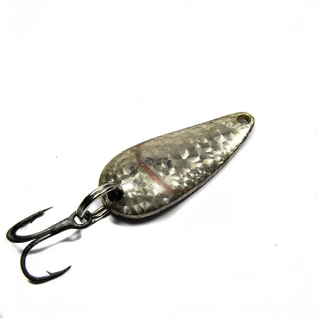 Hamrade strukturer fångar ljuset över Crystal silver scale-finishen på detta 3 cm (1 1/4") skeddrag. Denna Eppinger Lildevle, med produktkod 0341, har den klassiska Detroit U.S.A.-stämpeln på baksidan, en detalj som markerar dess ursprung från Michigan-verkstaden grundad av Lou Eppinger. Med en vikt på 3,4 g (1/8 oz) består hårdvaran av en robust trekrok ansluten via en säker fjäderring. Draget är i 4/5 skick, med välbevarad plätering och tydliga stämplar. Den konkava kroppsformen är utformad för en distinkt vaggande rörelse vid jämn invevning, vilket gör det till ett givet val för spinnfiske i både klart och grumligt vatten. Den strukturerade ytan är avsedd att imitera blänket från små betesfiskar, en designprincip Eppinger har använt sedan början av 1900-talet.