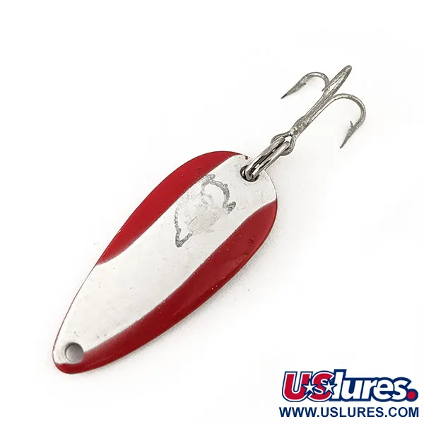 Med en vikt på smidiga 3/16 oz (6 g) är denna skapelse från Eppinger ett klassiskt exempel på amerikanskt hantverk inom betestillverkning. Metallkroppen på 1 1/2" (3,5 cm) har det ikoniska röd-vitrandiga mönstret på framsidan, kompletterat med den karaktäristiska djävulshuvudslogotypen stämplad i pläteringen. På baksidan finns graveringen "DARDEVLE MIDGET U.S.A.", ett kännetecken för dess ursprung i Dearborn, Michigan. Detta specifika exemplar, identifierat med produktkod 11159, är i utmärkt skick med betyget 5/5, och har en blank finish och rena detaljer. Det är utrustat med en robust fjäderring och en enkel trekrok. Den konkava formen på detta skeddrag är samma design som gav Dardevle en plats i flygvapnets överlevnadskit under andra världskriget tack vare dess pålitlighet vid både spinnfiske och trolling. Trots att den är mindre än den traditionella Dardevle, håller Midget samma konstruktionsstandard som Lou Eppinger etablerade 1906.