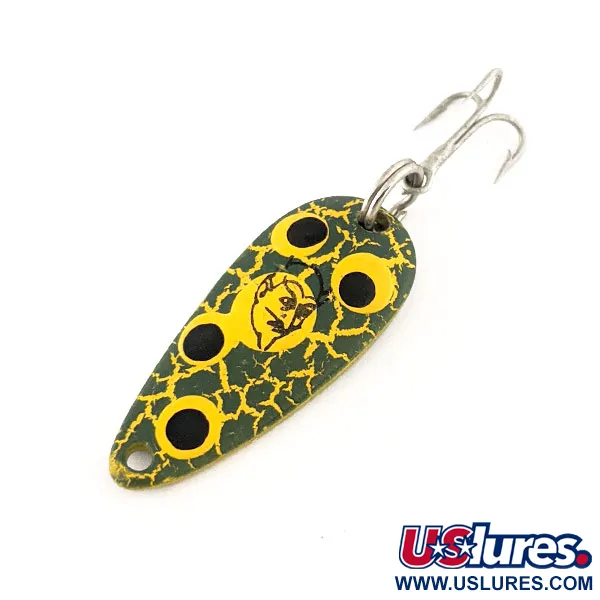 På baksidan finns den tydliga stämpeln «DARDEVLE MIDGET U.S.A.», vilket identifierar detta som ett äkta Eppinger-drag. Detta specifika exemplar, katalogiserat under produktkod 11508, har den ikoniska «Frog»-finishen – ett livfullt grönt och gult crackle-mönster med gula cirklar och svarta mittpunkter. Mitt på draget syns den klassiska svarta djävulshuvud-logotypen inuti en gul glob, ett kännetecken för märket sedan Lou Eppinger startade i Detroit 1906. Med en smidig vikt på 6 g (3/16 oz) och en längd på 3,5 cm (1 1/2") är Midget-storleken ett mångsidigt val för fiske efter öring eller abborre. Metallkroppen och färgen är anmärkningsvärt välbevarade, vilket ger draget ett skickbetyg på 5/5. Det är fortfarande utrustat med sin ursprungliga silverfärgade trekrok och fjäderring. Precisionen i de egna pressformarna syns i dragets jämna, konkava kurva, en signaturdesign som har varit en stapelvara i fiskelådor ända sedan företaget flyttade till Dearborn 1959.
