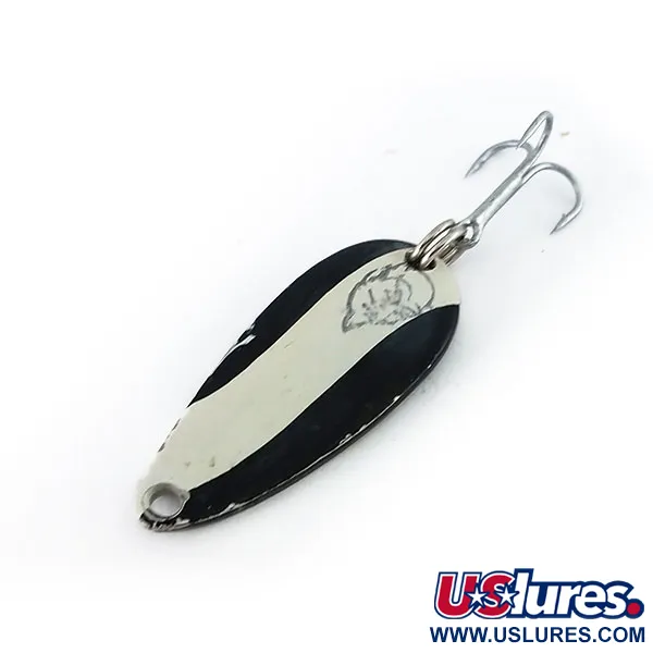 Stämplingen på den polerade baksidan av nickel identifierar tydligt detta skeddrag som ett original från Eppinger, märkt med "DARDEVLE MIDGET U.S.A.". Det högkontrasterande svart-vit-randiga diagonalmönstret på framsidan är ett måste i varje seriös dragask. Med en längd på 3,5 cm (1 1/2") och en vikt på 6 g (3/16 oz) är detta exemplar ett utmärkt exempel på beten med mindre profil för lätt fiske. Den ikoniska djävulshuvud-grafiken syns tydligt på den centrala vita randen. Hårdvaran är solid och består av en fjäderring och en vass trekrok. Skicket är 5/5 och därmed utmärkt, med endast en antydan till färgslitage precis vid linöglan, medan baksidan av nickel har kvar sin spegelblanka lyster. Eppingers historia i Michigan märks i kvaliteten på metallarbetet, som tillverkats med deras egna specialverktyg. Detta färgschema, valt för sin synlighet i olika vattenförhållanden, förblir en favorit bland dem som uppskattar arvet Lou Eppinger startade i sin källare 1906. Den konkava formen på metallkroppen är signumet för produktionen från fabriken i Dearborn.