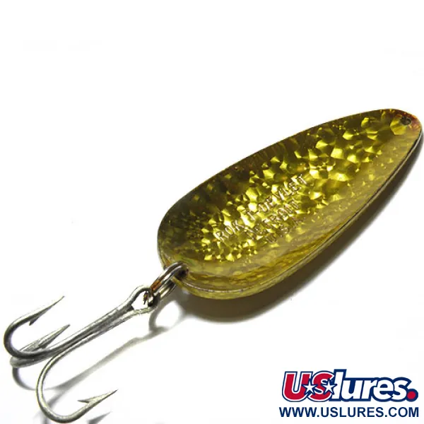 Denna Dardevle Rok't Devlet från Eppinger mäter 7 cm (2 3/4") och har en tung metallkropp för betydande kastlängder. Med en vikt på 35 g (1 1/4 oz) har draget produktkod 0300 och en finish i Kristall Gyllene Kristall-mönster som ger en kraftig visuell blänk. Den konkava skedprofilen ger en unik vaggande gång vid invevning. Detta exemplar är i skick 4/5, med välvårdade ytor och originaltrekrok. Tillverkad i USA med egna formar, följer designen den tradition som grundades av Lou Eppinger i Detroit 1906. Identifikationsstämpeln på metallen speglar det anrika arvet från företaget som numera är baserat i Dearborn.