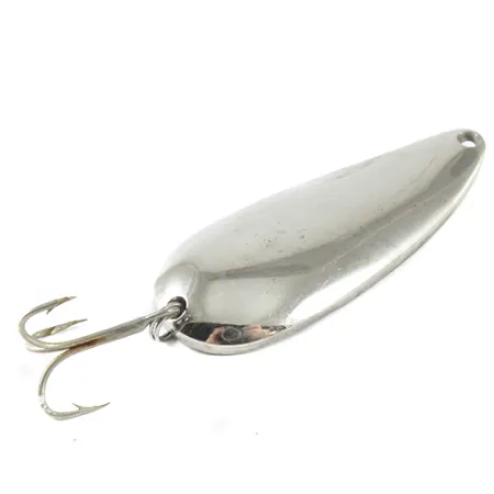 Tydligt präglat på den inre konkava ytan finns den klassiska markeringen ”ROK'T DEVLET DETROIT U.S.A.”, ett kännetecken för Eppingers produktion innan de flyttade till Dearborn 1959. Med en betydande vikt på 35 g (1 1/4 oz) är Dardevle Rok't Devlet ett formidabelt verktyg för att nå djupare vattenlager jämfört med lättare skeddrag. Nickelfinishen på detta 7 cm (2 3/4") långa bete förblir blank, med vissa ärliga tecken på hantering som stämmer överens med ett skickbetyg på 4/5. Kraftig metallkonstruktion definierar detta drag och återspeglar de standarder som Lou Eppinger etablerade i sin källare i Detroit redan 1906. Detta exemplar med produktkod 1656 har en precisionsstansad droppformad profil som är utformad för att skapa ett distinkt vattenförflyttningsmönster vid jämn invevning. Hårdvaran består av en robust trekrok säkrad med en fjäderring, medan linöglan i den smala änden är väl definierad för att säkerställa korrekt balans.