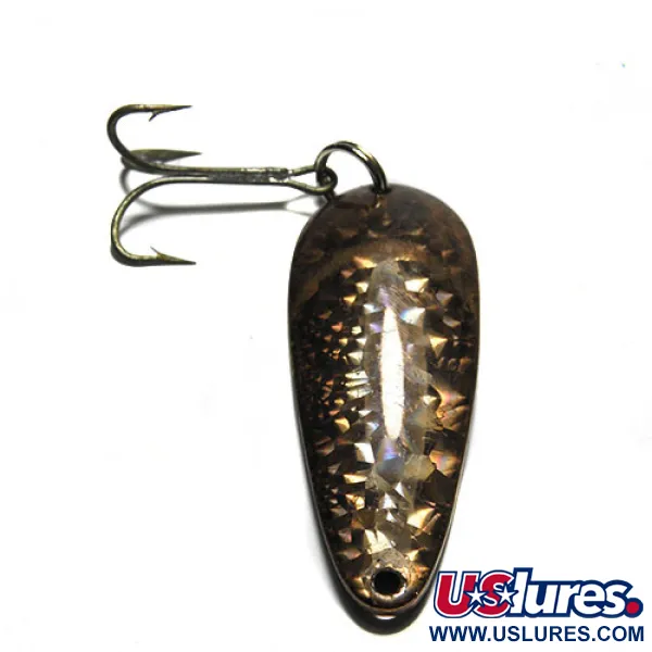 Med en vikt på 3/4 oz (21 g) uppvisar detta kompakta skeddrag den klassiska amerikanska kvalitet som Eppinger har bevarat sedan Lou Eppinger grundade företaget 1906. Denna Dardevle Rok't Imp-modell mäter 2 1/4" (5,5 cm) och har en distinkt kopparfinish toppad med ett texturerat, prismatiskt hologrammönster som reflekterar ljus över den konkava ytan. Genom att använda egna gjutformar — ett signum för tillverkaren i Dearborn, Michigan — pressas metallen till en specifik tjocklek som lämpar sig för kast i hård vind eller trolling på djupet. Skedens baksida är stämplad med modellnamnet, vilket visar kopparbasens värme. Den levereras utrustad med en robust trekrok och en pålitlig fjäderring, redo för fiske eller samlarhyllan. Vi har graderat detta exemplar till skick 4/5, då finishen är intakt och hårdvaran sitter säkert. Katalognummer 0282; kombinationen av en mörk kopparbaksida och en glimrande hologramframsida gör det till ett mångsidigt verktyg för varierande vattenförhållanden där en balans mellan lyster och naturliga toner krävs.