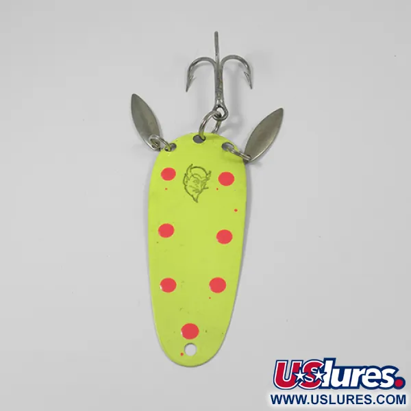 Livlig chartreuse-gul färg med tydliga röda prickar täcker framsidan på detta 8,5 cm drag från Eppinger. Katalogiserat under produktkod 2016, är detta exemplar i exceptionellt rent skick (5/5), och har kvar sin blanka finish och tydliga stämplingar. Denna Dardevle Sagamore JT Buel-modell har en specialiserad hårdvarukonfiguration baktill där två små silverskimrande blad är monterade bredvid trekroken, vilket ger betydande metalliskt blänk till dess vikt på 12 g. På baksidan är förnicklingen tydligt märkt med namnet Sagamore JT Buel och "Detroit, U.S.A.", vilket refererar till den historiska härstamningen och tillverkningsrötterna i Michigan. Den ikoniska djävulshuvud-logotypen är centrerad på den målade sidan, vilket identifierar den som en äkta del ur Eppingers långvariga katalog.