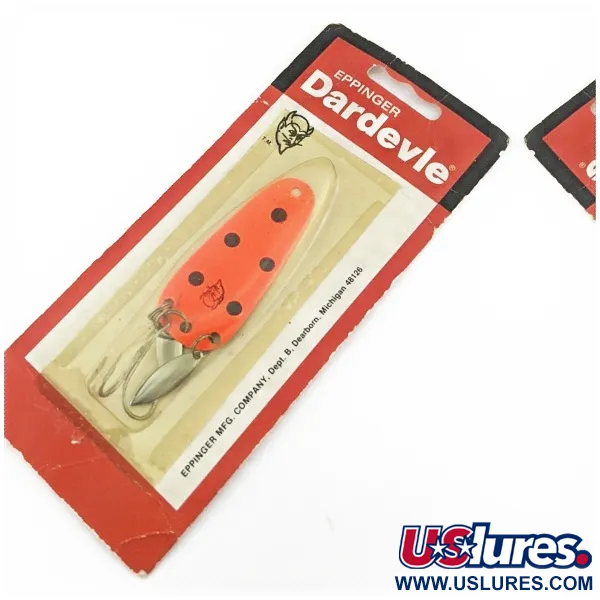 Det klassiska Lady Bug-mönstret – en livfull orange finish med tydliga svarta prickar – fångar omedelbart blicken på detta exemplar. Med en vikt på 1/4 oz (7 g) och en längd på 2 1/2" (6,5 cm) utgör denna Sagamore JT Buel-modell en länk mellan modern tillverkning och ursprunget för amerikanska trollingskedar. Eppinger utvecklade denna serie som en hyllning till J.T. Buels banbrytande skeddragskonstruktioner, vilket resulterade i en bred profil utrustad med ett dubbelbladssystem. Dessa blad är utformade för att rotera och ge ifrån sig blänk vid trolling i jämn fart efter gädda eller öring. Betet, som har produktkod 24413, är oanvänt och ligger kvar i sin förseglade originalförpackning i vintage rött och svart. På baksidan av förpackningen syns fortfarande tydligt adressen till Eppinger Mfg. Company i Dearborn, Michigan.