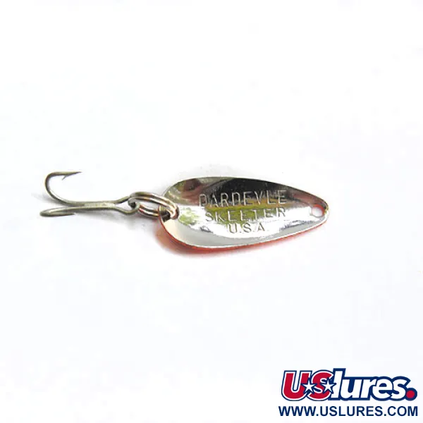 Detta lilla skeddrag, som bara mäter 2,3 cm (1"), är ett klassiskt stycke amerikanskt hantverk från Eppingers verkstäder. Det har en livlig Fluorescent Orange / Black-finish och metallkroppen har tydliga svarta prickar och den ikoniska djävulshuvudlogotypen stämplad i mitten. Med en fjädervikt på 1g (1/32oz) är Dardevle Skeeter (Produktkod 0133) utformad för ultralätt fiske där precision är avgörande.