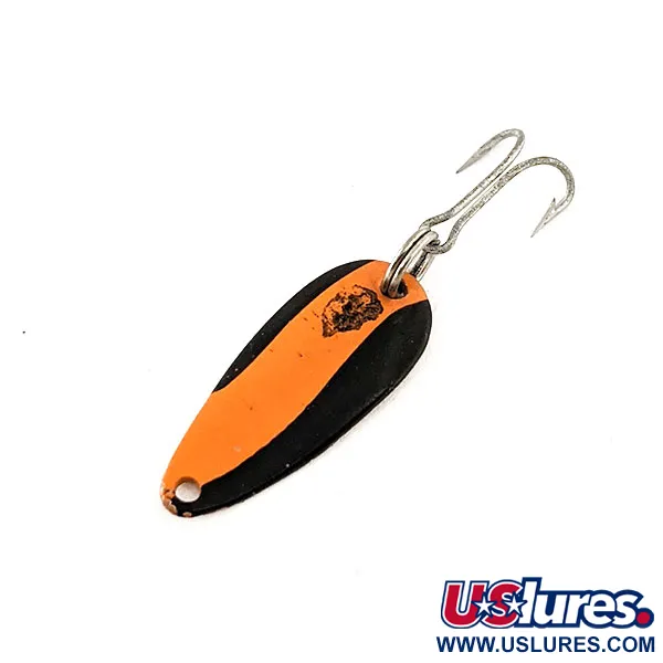 Kopparfärgad metall på baksidan av detta lilla skeddrag på 2,3 cm (1") ger en varm kontrast till den djärva emaljen på framsidan. Tydligt stämplat med "DARDEVLE SKEETER U.S.A.", avslöjar baksidan arvet från Lou Eppingers Michigan-baserade företag, som har tillverkat dessa drag sedan 1906. Med en delikat vikt på 1 g (1/32 oz) har exemplaret en slående svart finish delad av en livlig orange diagonal rand. Denna specifika färgpalett föredras ofta av sportfiskare för dess förmåga att skapa en silhuett med hög kontrast i olika vattenförhållanden. Emaljen visar visst lätt slitage nära linfästet, vilket är vanligt för autentiska vintage-drag från denna era. Det är utrustat med en vass trekrok säkrad med en fjäderring vid basen. Draget är i skick 5/5 och bibehåller sin strukturella integritet och livfulla finish. Samlare kan identifiera denna specifika modell med produktkod 11630. Dessa ultralätta skeddrag var traditionellt utformade för fiske efter abborre eller öring med lätta linor.