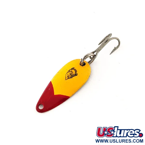 Röd och gul emaljlack definierar framsidan på detta lilla skeddrag och visar upp ett levande färgmönster som har varit en klassiker i årtionden. Med ett mått på exakt 1" (2,3 cm) och en vikt på 1/32 oz (1 g) är Skeeter-modellen byggd för ultralätt utrustning vid fiske efter abborrfiskar eller öring. Den förnicklade baksidan bär den tydligt stämplade texten "DARDEVLE SKEETER U.S.A.", ett signum för Eppingers arv som började i Detroit 1906. Detta exemplar, identifierat med produktkod 11631, pryds av den ikoniska djävulshuvudlogotypen centrerad på det gula fältet. Det är utrustat med en dubbelkrok säkrad av en robust fjäderring, vilket möjliggör effektivt fiske i små bäckar. När det gäller skicket är draget graderat till 5/5, med dess glansiga finish och detaljer i välbevarat skick. Metallens konkava form är det utmärkande draget för dessa Michigan-tillverkade skedar designade för precisionskast.