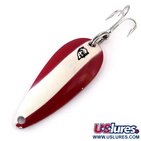 Polerad nickel täcker baksidan av detta 9g (1/3 oz) skeddrag, som bär det ikoniska stämplade varumärket och ursprunget "U.S.A.". Dardevle Spinnie (artikelnummer 10302) mäter 4,5 cm (1 3/4") och visar upp det klassiska röd-vita diagonala randmönstret som har varit en stapelvara i fiskelådor ända sedan Lou Eppinger började handtillverka drag i Detroit. Den målade sidan har en liten svart djävulshuvud-logotyp nära fästpunkten för fjäderringen. Detta specifika exemplar är i skick 5/5 och uppvisar de klara pigment och den högblanka plätering som förväntas av ett välbevarat vintage Eppinger-drag. Utformad för spinnfiske eller trolling ger den konkava formen och den viktade kroppen hos Spinnie den distinkta vaggande gång som lade grunden för företagets rykte efter grundandet 1906. Komponenterna är solida, med en silverfärgad trekrok säkrad med en fjäderring. Denna storlek är särskilt effektiv för abborrfiskar eller öring, vilket återspeglar de tillverkningsstandarder som fortfarande upprätthålls i fabriken i Dearborn, Michigan.