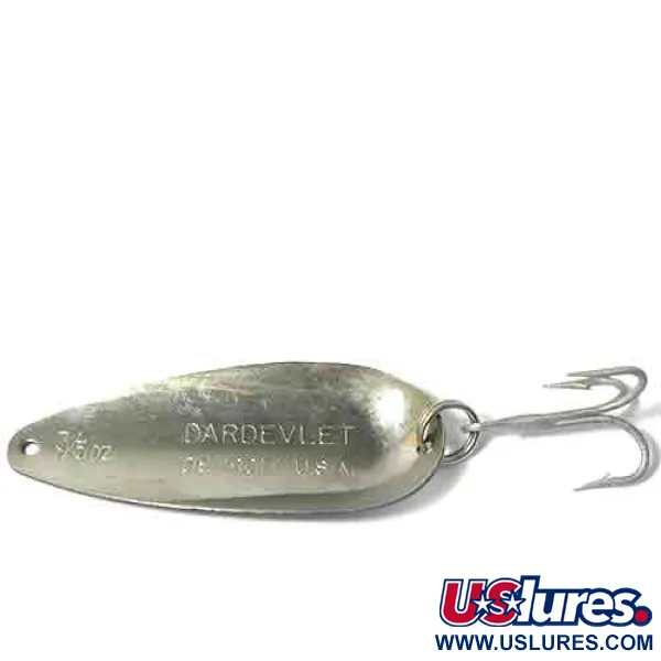 En tydlig vit rand löper längs mitten av detta 22 g (3/4 oz) skeddrag, inramad av djupsvarta sektioner som ger en skarp visuell kontrast. I mitten finns den ikoniska djävulshuvud-logotypen tydligt stämplad, vilket identifierar draget som en äkta Eppinger-skapelse från deras långa historia av amerikansk tillverkning. Denna Dardevlet, katalogiserad under produktkod 0026, mäter 7 cm (2 3/4 tum) och har kvar sin originalutrustning, inklusive fjäderring och trekrok. Den målade ytan visar naturligt slitage och lätt färgförlust runt kanterna och nära kroken, vilket ger ett skickbetyg på 3/5. Just detta färgmönster designades för synlighet under olika vattenförhållanden och är en funktionell del av Detroits sportfiskehistoria.