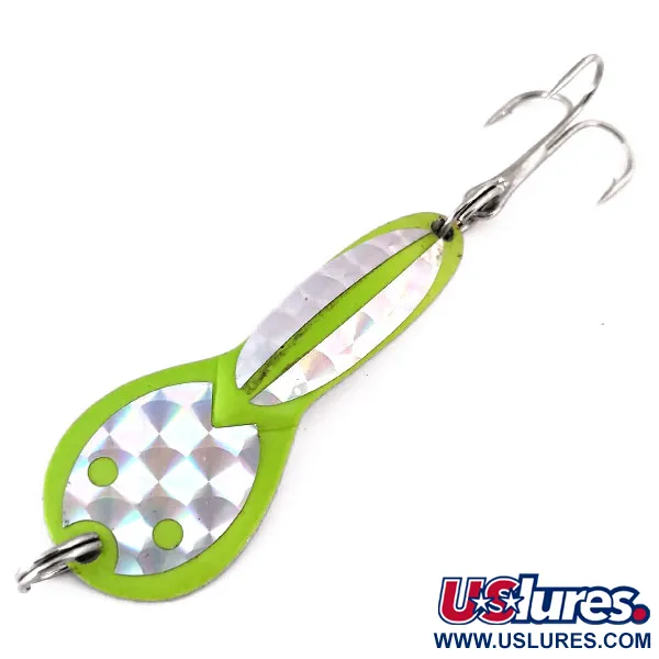 Chartreuse-detaljer på en polerad nickelkropp gör detta 7 g (1/4 oz) skeddrag mycket synligt under varierande vattenförhållanden. Denna Dazzler #2, med produktkod 10300, är en amerikansktillverkad klassiker från Acme som sedan dess har utgått ur sortimentet, vilket gör den till ett eftertraktat vintage-objekt. Skeddraget mäter 5 cm (2") i längd och har en distinkt timglasinspirerad form med ett texturerat holografiskt prismanlägg på framsidan för att reflektera ljus. På baksidan syns varumärkesstämpeln 'DAZZLER 2' tydligt inpräglad i metallytan. Trots att det levereras utan originalförpackning är exemplaret i oanvänt skick, vilket bevarar den fabriksnya finishen och original-trekroken. Sportfiskare använder vanligtvis denna modell för spinnfiske eller trolling i grunda miljöer upp till 1 m, särskilt vid fiske efter gädda i vatten utan ström. Konstruktionen inkluderar robusta fjäderringar i båda ändar för säker lininfästning och krokfäste.