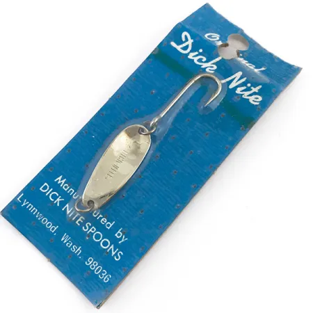 Detta Dick Nite #1 mäter exakt 2,5 cm (1") i längd och har en tunn metallprofil med en blank, klassisk nickelfinish. Tillverkad i USA av Dick Nite Spoons under produktkod 4939, speglar detta exemplar den traditionella tillverkningsstilen från Lynnwood, Washington. Med en fjädervikt på 1/32 oz (1 g) är skeddraget avsett för lätt spinnfiske eller trolling där en liten profil krävs. Det är i oanvänt skick, fortfarande fäst vid den blå originalförpackningen i kartong med företagets "Original Dick Nite"-logotyp. Dragets yta är ren och reflekterande, med en enkelkrok monterad i den bakre öglan.