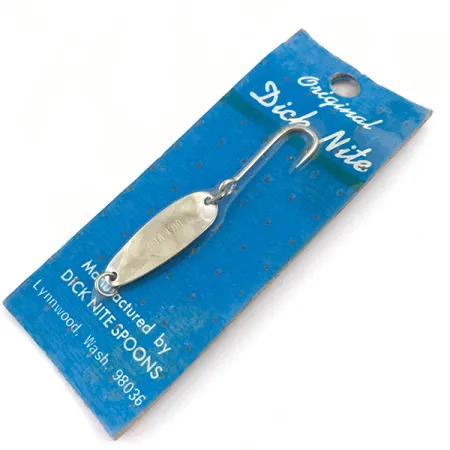 Med en vikt på endast 1/32oz (1g) exemplifierar detta fjäderlätta skeddrag den finess som krävs vid traditionellt skedfiske. Dick Nite #1 mäter kompakta 1" (2,5cm) och är stansad med en ren nickelfinish som reflekterar ljus effektivt. Detta specifika exemplar, identifierat med produktkod 4941, ligger kvar i sin ursprungliga blå vintageförpackning från Dick Nite Spoons-fabriken i Lynnwood, Washington. Förpackningen visar varumärkets historia och stoltserar med sitt amerikanska ursprung i postnummerområdet 98036. Detta bete är oanvänt och i nyskick, vilket bevarar integriteten hos enkelkroken och originalmonteringen. Den tunna konstruktionen är ett signum för Dick Nite-designen, framtagen för trolling och spinnfiske där en subtil profil är nödvändig.