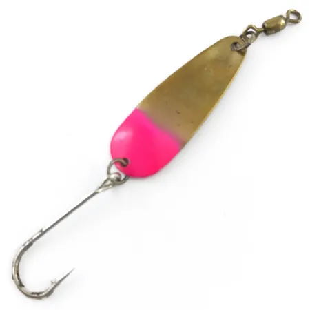 Vikten på 1,7 g (1/16 oz) ger Dick Nite #2 den idealiska profilen för finessfiske i klart vatten. Skeddraget är 3,5 cm (1 1/2") långt och har en tvåfärgad finish i Guld / Röd, där den röda delen har en levande, fluorescerande lyster som sticker ut mot metallbasen. Varumärket är tydligt präglat i den guldfärgade metallen, vilket identifierar dess ursprung hos Dick Nite Spoons i USA. Detta specifika exemplar, med produktkod 5314, är utrustat med sitt ursprungliga lekande i mässing och en enkelkrok med långt skaft. Med ett skick på 4/5 uppvisar betet en ren yta och välvårda detaljer. Den tunna godstjockleken återspeglar de traditionella tillverkningsteknikerna för dessa beten, som är särskilt utformade för effektiv användning vid trolling i låga hastigheter.