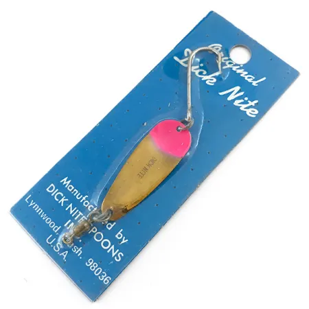 Den vibrerande rosa färgen på huvudet på detta mässingstonade skeddrag skapar en högkontrastmåltavla för både öring och lax. Med ett mått på 3,5 cm (1 1/2") och en vikt på 1,7 g (1/16 oz) är detta skeddrag i storlek #2 en klassiker från Pacific Northwest. Det har den traditionella Dick Nite-profilen med en enkelkrok, säkrad av en robust fjäderring baktill. Metallkroppen är stämplad med namnet ”DICK NITE” mitt på den guldfärgade ytan. Dessa skeddrag är designade för lätt fiskeutrustning och används vanligtvis för trolling eller spinnfiske i älvsystem där ett subtilt blänk krävs. Att hitta ett i sin blå originalförpackning från ”Dick Nite Spoons” från Lynnwood, Wash. är en fröjd för samlare; detta specifika exemplar är oanvänt och i utmerkt skick. Tillverkat i USA, och Lynnwood-adressen på förpackningen vittnar om märkets långa arv i delstaten Washingtons sportfiskescen.