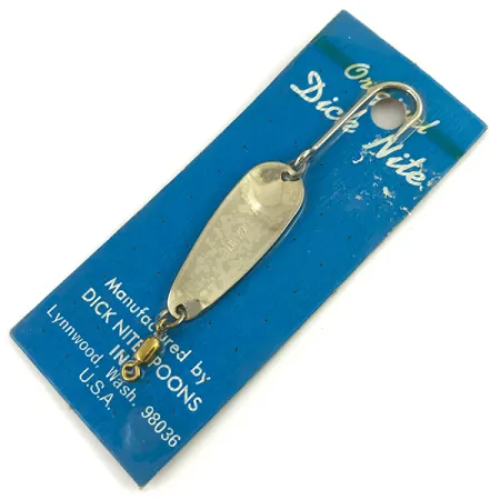 Detta Dick Nite #2 skeddrag är polerat till en spegelblank nikkelfinish, mäter 3,5 cm (1 1/2") och bär tillverkarens kvalitetsstämpel från fabriken i Lynnwood, Washington. Med en vikt på 1,7 g (1/16 oz) har draget en droppformad kropp och är utrustat med ett lekande i mässing och en trådfästning i rostfritt stål. Detta specifika objekt, med produktkod 7369, är i oanvänt skick och bevarat exakt som det lämnade fabriken på sitt karakteristiska blåa originalkort. Texten på vintageförpackningen framhäver ursprunget från USA och identifierar det som en originaldesign. Samlare noterar den tydliga texten och den säkra monteringen av hårdvaran, vilket är typiskt för dessa klassiska öring- och laxdrag från mitten av seklet. Konstruerat för trolling eller spinnfiske, kombineras den tunna metallskeden med en stadig trådkonstruktion för att behålla sin form.