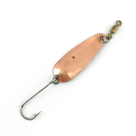 Detta klassiska #2 skeddrag i koppar ger en varm metallisk finish som reflekterar ljuset effektivt under olika vattenförhållanden. Draget mäter 3,5 cm (1 1/2") och väger 1,7 g (1/16 oz). Detta tunnbladiga bete är tillverkat i USA och har den distinkta "DICK NITE"-stämpeln på baksidan. Skeden är utrustad med en robust enkelkrok och en mässingsfärgad lekare för att hantera linvridning under användning. Med betyget 5/5 är exemplaret exceptionellt välbevarat och uppvisar en ren metallyta som framhäver den karakteristiska lyster som Dick Nite är känd för i Pacific Northwest. Denna specifika modell, artikelkod 7378, speglar varumärkets långa historia av att producera effektiv utrustning för öring- och steelheadfiskare som föredrar ett lätt, traditionellt fiske.