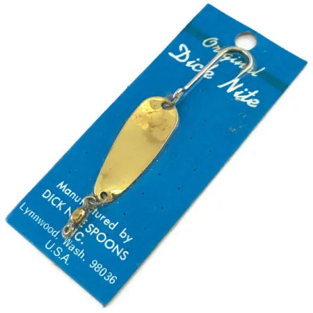 Guldpläteringen ger en mycket synlig yta på detta Dick Nite #2, som har sitt ursprung i Lynnwood, Wash. 98036, USA. En vikt på 1/16 oz (1,7 g) parat med en längd på 1 1/2" (3,5 cm) gör det till ett föredraget val för entusiaster av lätt fiske som siktar på arter som öring eller kokanee. Skeddraget har en tunn profil konstruerad för både trolling och spinnfiske. Med produktkod 8020 är detta specifika bete ett oanvänt exemplar, fortfarande fäst vid sitt ursprungliga blåa baksideskort, och ges ett skickbetyg på 6. En förmonterad lekare är fäst vid den främre öglan för att hjälpa till med linhantering, medan en robust enkelkrok är monterad baktill.