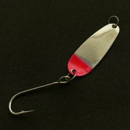 Med en vikt på endast 1 g (1/32 oz) har detta exemplar den klassiska finishen i nickel och rött som har gjort dessa skeddrag till en stapelvara i nordvästra USA under årtionden. Bladet med sin tunna profil mäter exakt 2,5 cm (1") och har tillverkarens namn stämplat direkt i den reflekterande metallen. Den nedre tredjedelen av draget är täckt med ett intensivt rött pigment, vilket skapar en skarp visuell kontrast mot den blanka nickelkroppen. Detta drag, med produktkod 23603, är utrustat med en enkelkrok med brett gap monterad med en robust fjäderring – en uppsättning som föredras för sin effektivitet vid både trolling och spinnfiske efter öring och kokanee. Denna USA-tillverkade klassiker är i absolut toppskick, klassificerad som 5/5, med en ren yta och skarpa färgövergångar. Den övre fjäderringen sitter säkert och är redo för fiske med lätt utrustning.